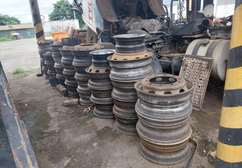 DESCRIÇÃO DO BEM: 6 rodas de ferro para caminhão/carreta, 22,5 sider,10 furos, roda a disco, todas em bom estado de conservação, na data da penhora, avaliadas cada uma no valor de R$500,00.